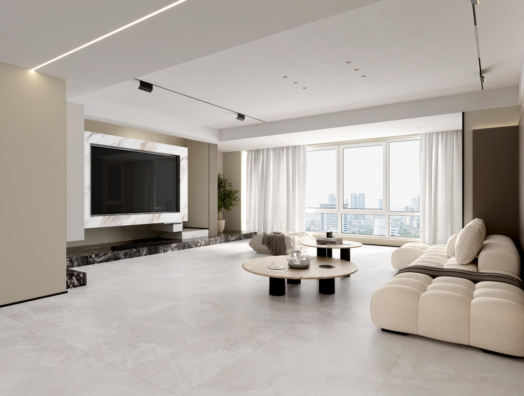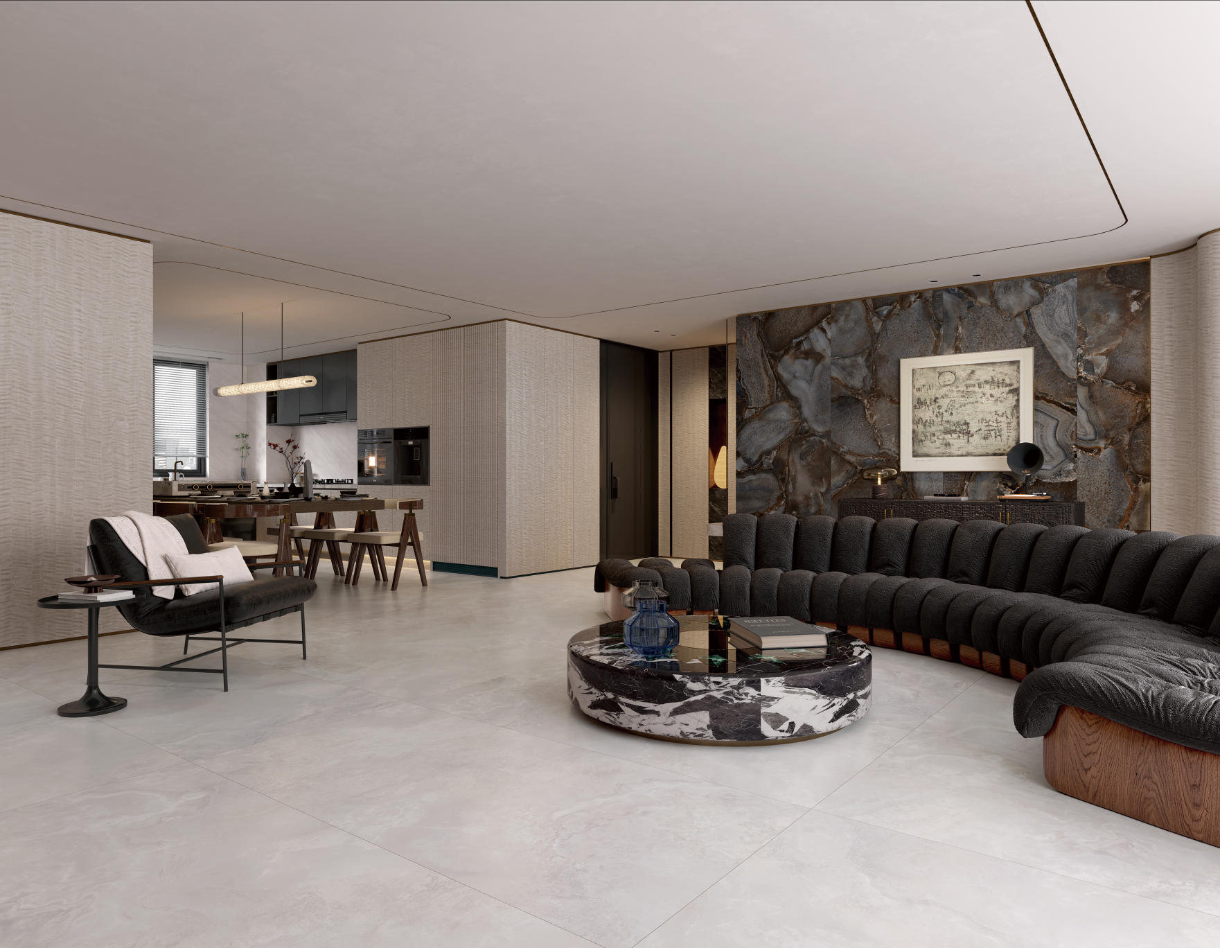 自然通透細(xì)膩,灰色線條、肆意飄散的紋理,深淺變化不一縱情延伸, 在空間里獨(dú)自綻放光彩,營造了獨(dú)特隨性的空間氛圍。
