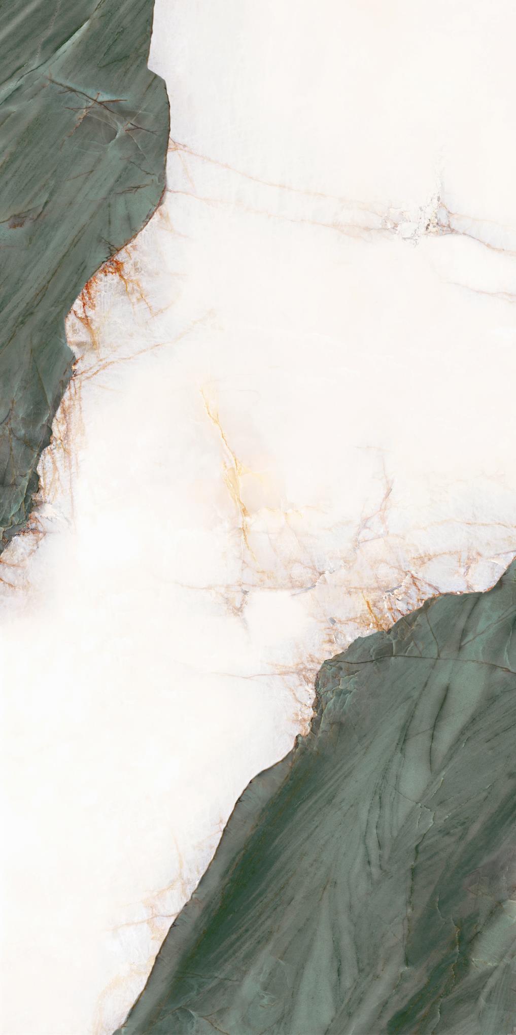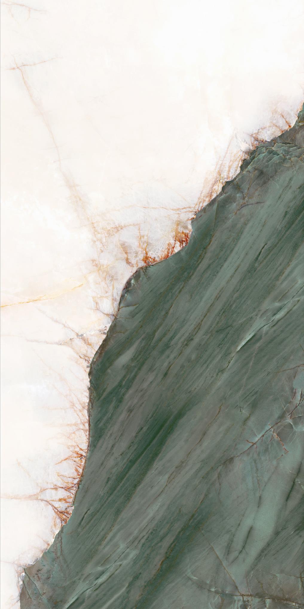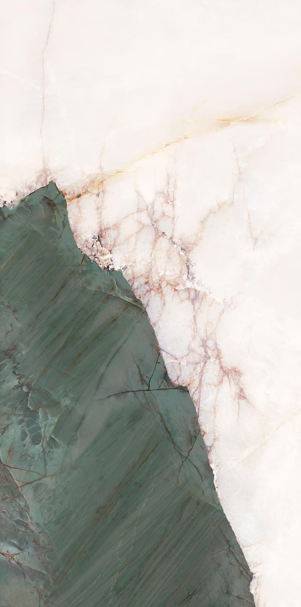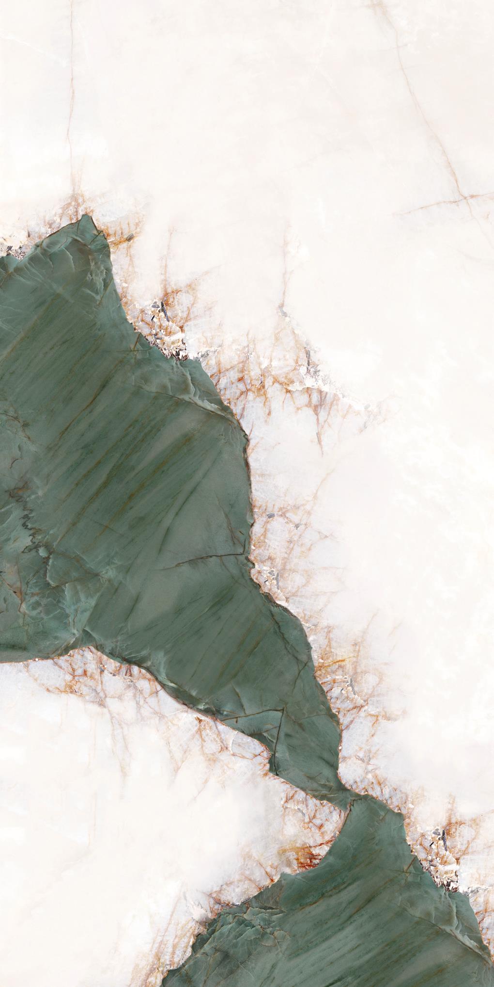 源于安第斯山脈上的珍罕寶玉。高飽和度的綠色基調(diào),勝似哥倫比亞祖母綠,蜿蜒的紋理,宏如萬頃碧波浩蕩之勢;肆意延伸的暖色紋理,似冰似玉且溫凈無瑕,有凝靈透徹之感。渾然天成的通透美感散發(fā)出與生俱來的高貴,寓意祥瑞降臨、地位尊崇的象征,更為空間平添幾分生機盎然。